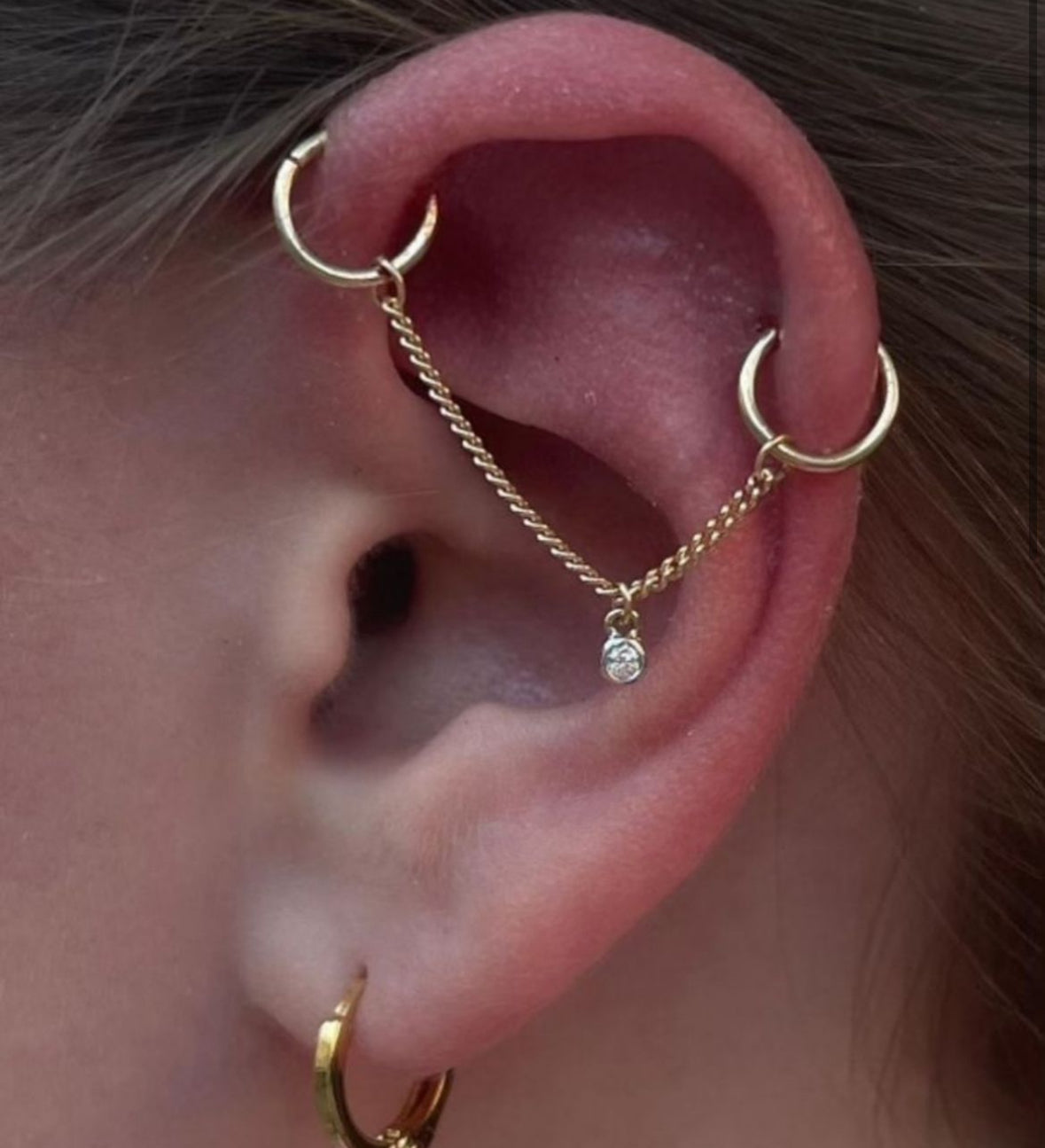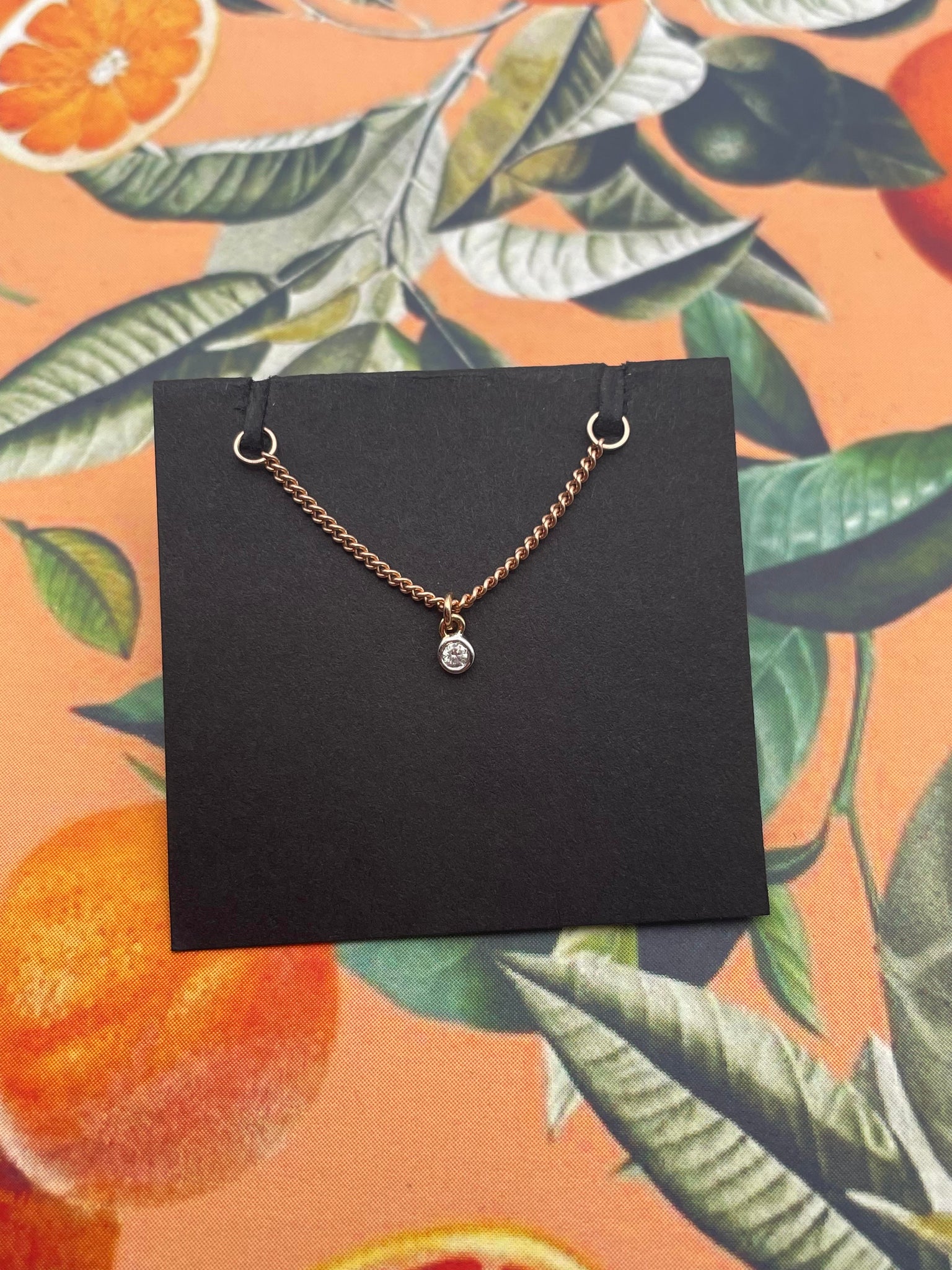 This piece is available with a Diamond Gem Charm on a chain?! Mind Blown. The Gem Charm is a 2.5mm Bezel Set Genuine Diamond. The 14K Gold Chain is a 1.1mm Curb Chain.