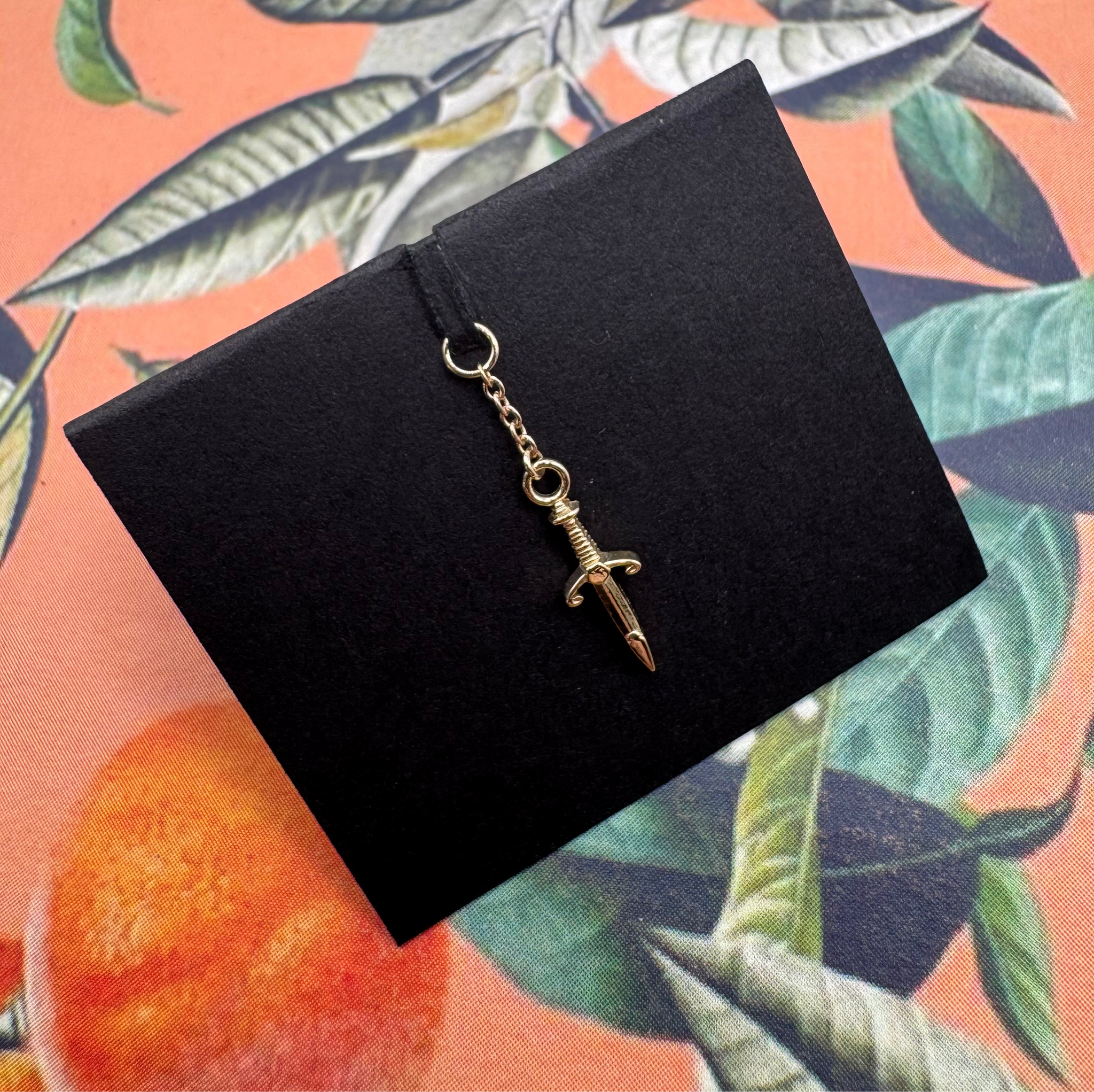 14K 13.2x4.5mm Solid Gold Dagger Charm previously on a 1.5mm Starburst Chain now they are made with a 1.2mm Cable Chain. These are fitted for 16-14g