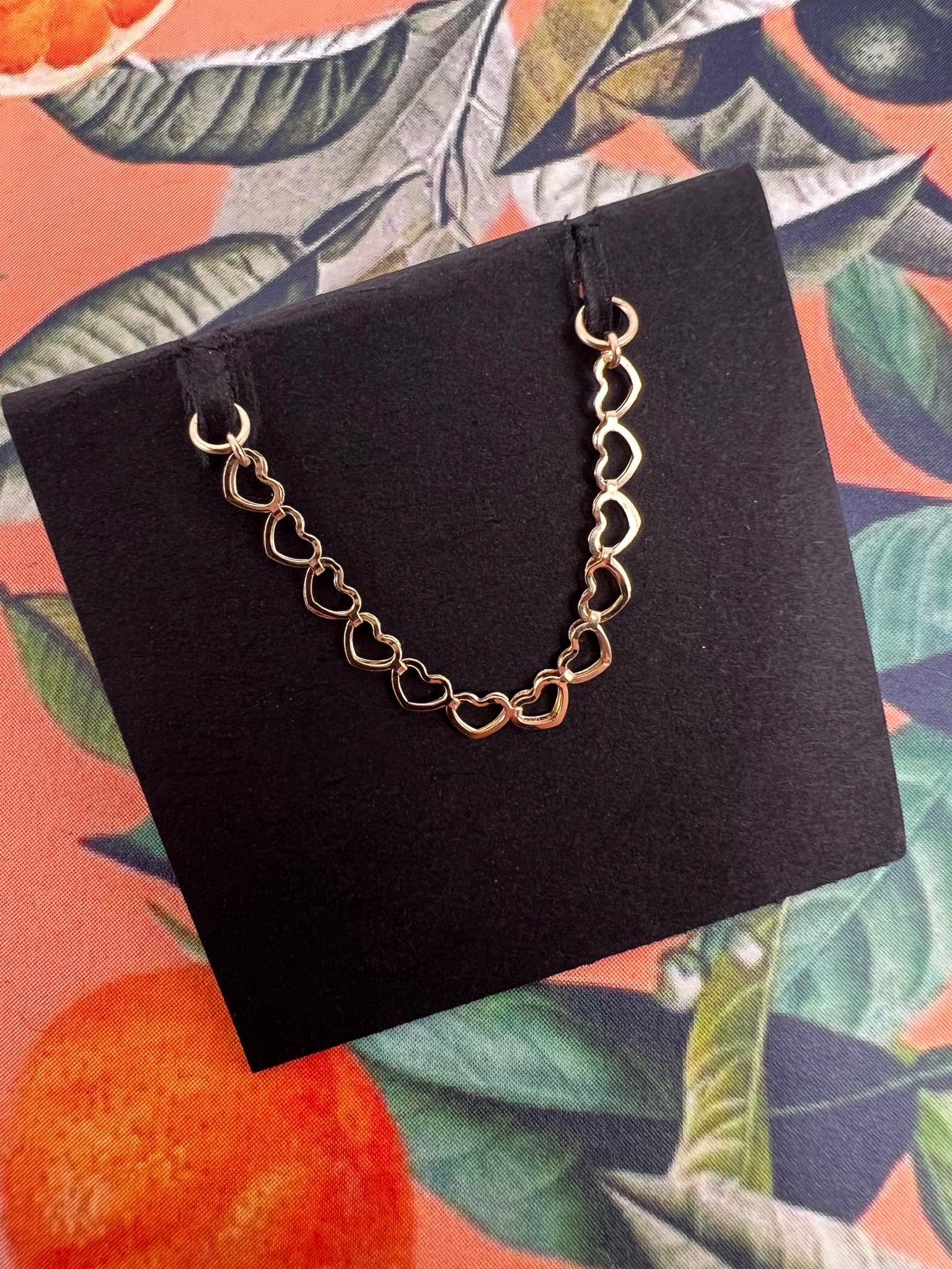 This chain is a show stopper. This is a super flush heart chain that comes in 14k Yellow Gold. The links are directly linked to one another and are all forward facing hearts. There is a 1.1mm jump ring attached at the end for a forward facing jump ring that will be fitted to the size you choose. Each heart on this chain is 4mm long and 2.8mm tall. So exciting!!