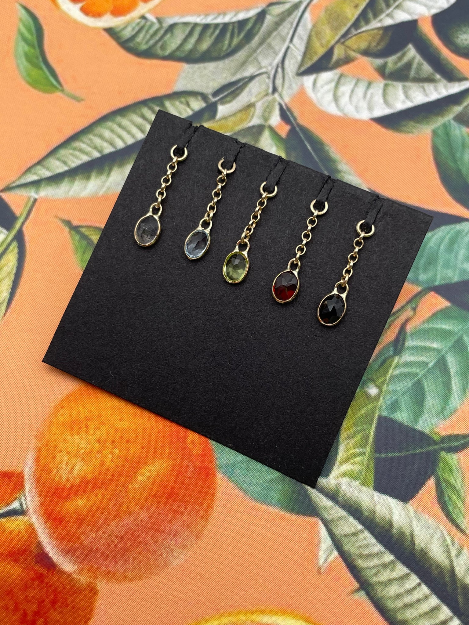 Select Oval 3x4mm Bezel Set Gem Charms suspended by a 1.3mm Rolo Chain sitting at 13mm long.