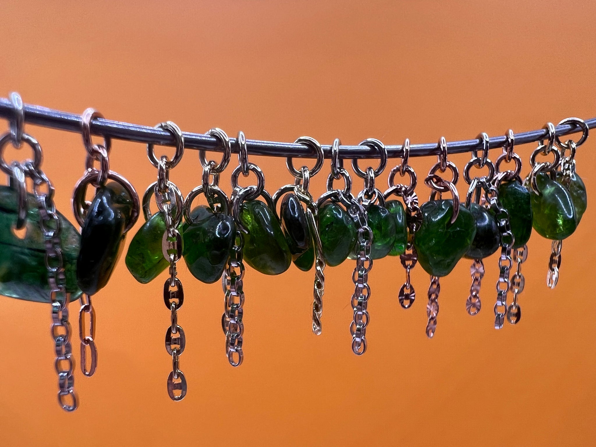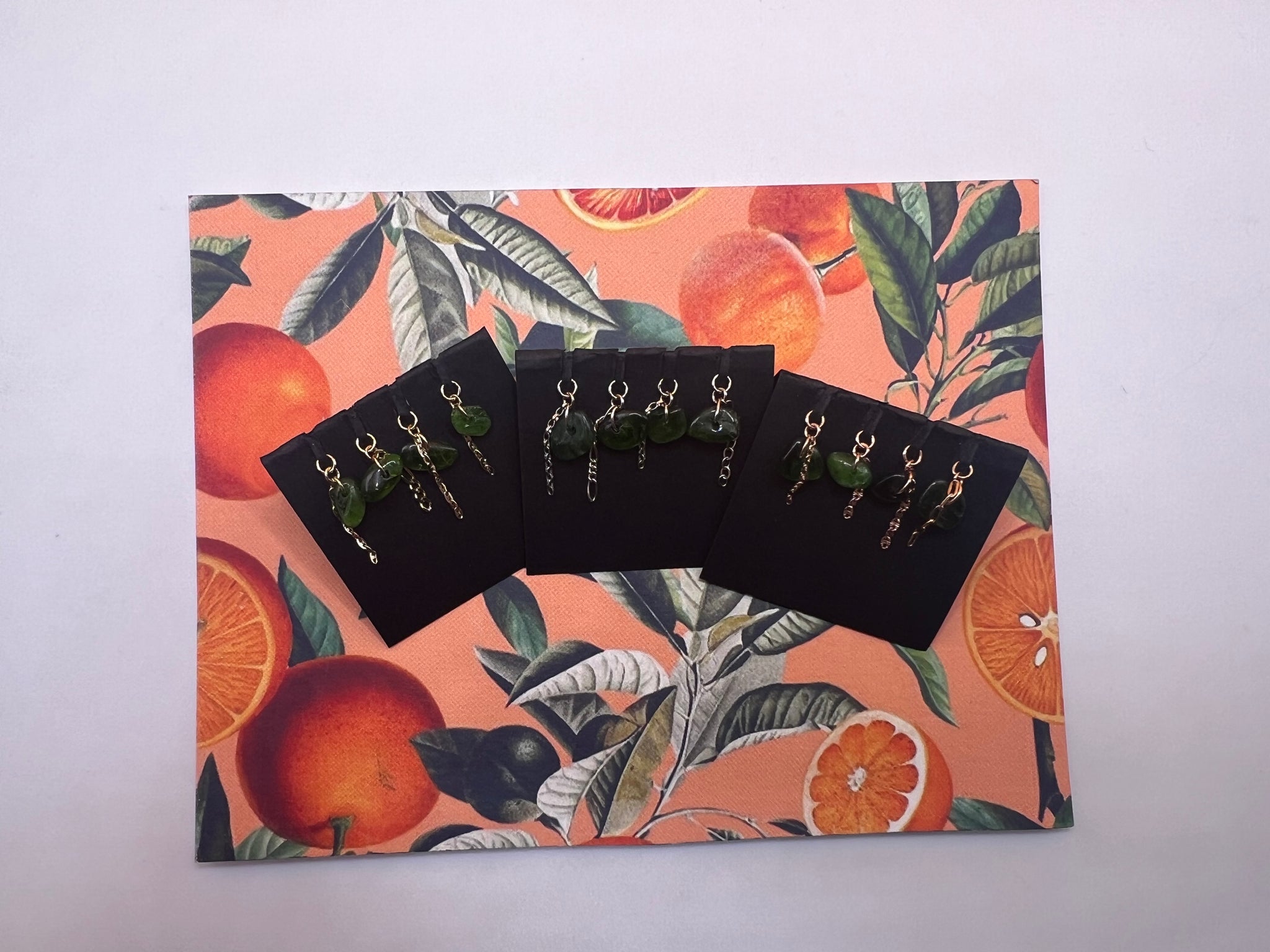 These Gemstones are sooo green they’re too green. People love green. They are Genuine Chrome Diopside Gem stones. They are hand drilled by….me! The gemstones are on average 3-6mm large and have a chain attachment that come in assorted styles. That chain is made of 14k Gold and is on average 12-14mm long.