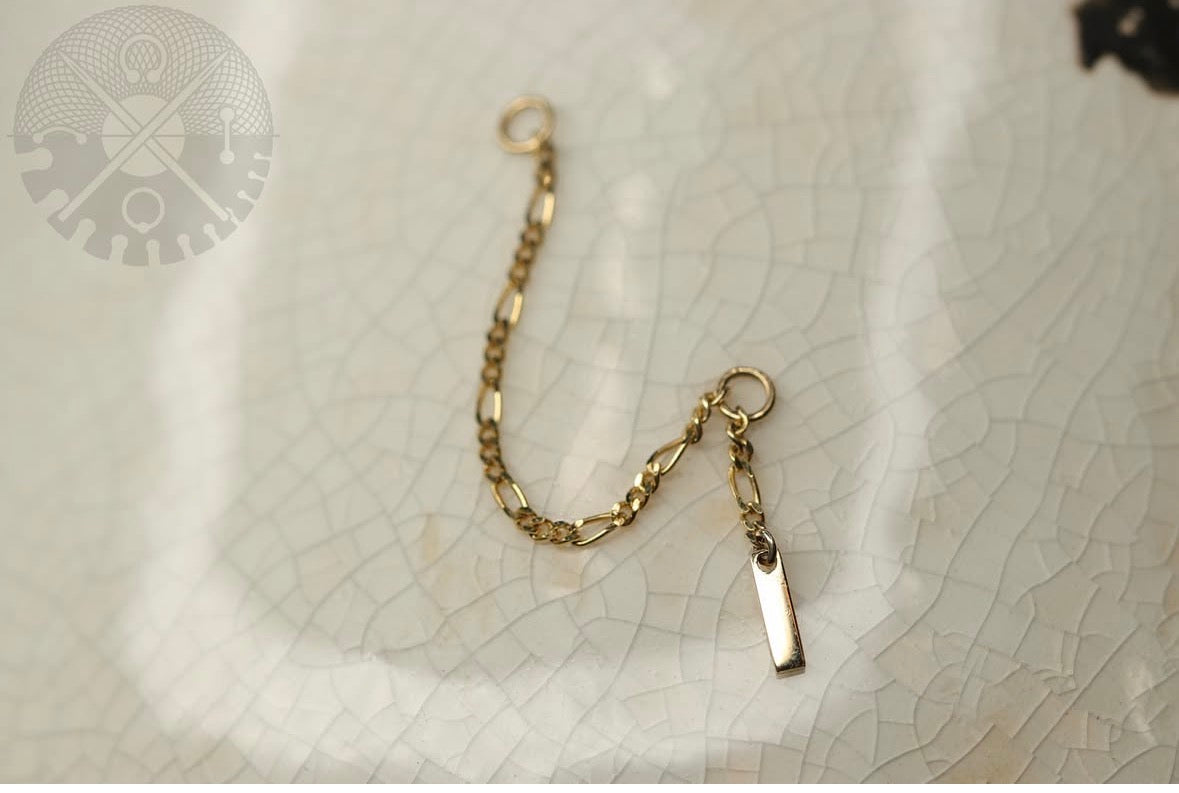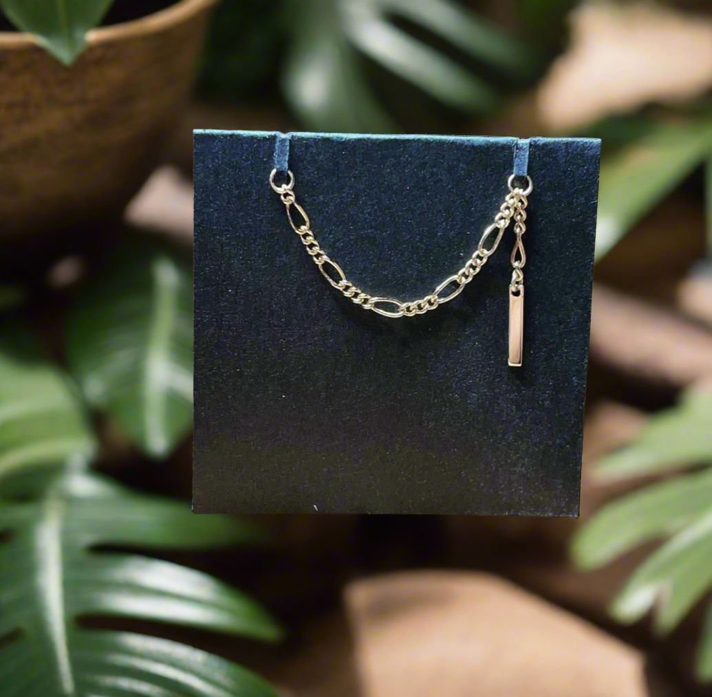 Done with a 1.5mm Diamond Cut 14K Yellow Gold Figaro Chain with a Solid Gold Bar Tassel that measures in at 6mm long. Gives THAT look!