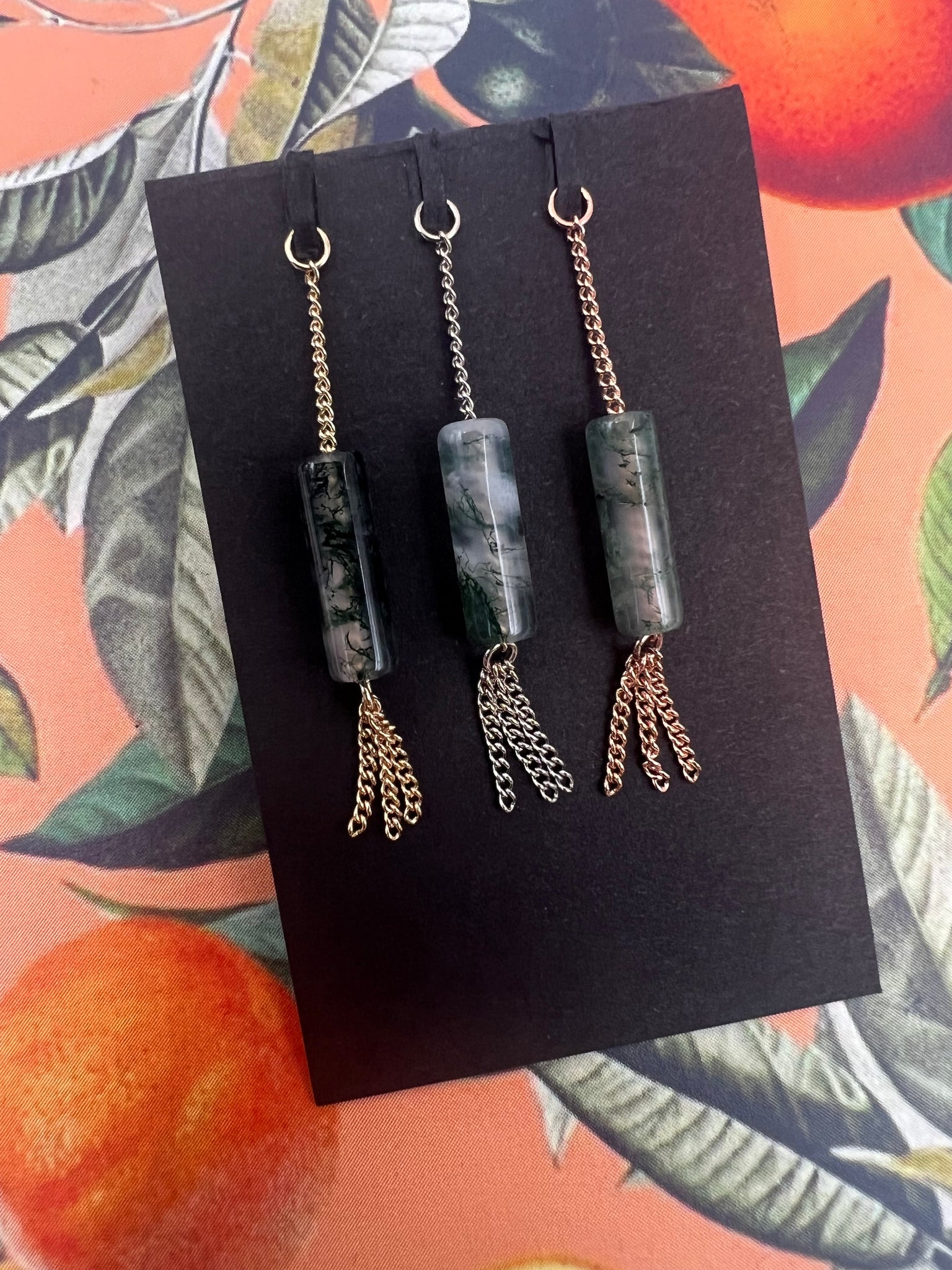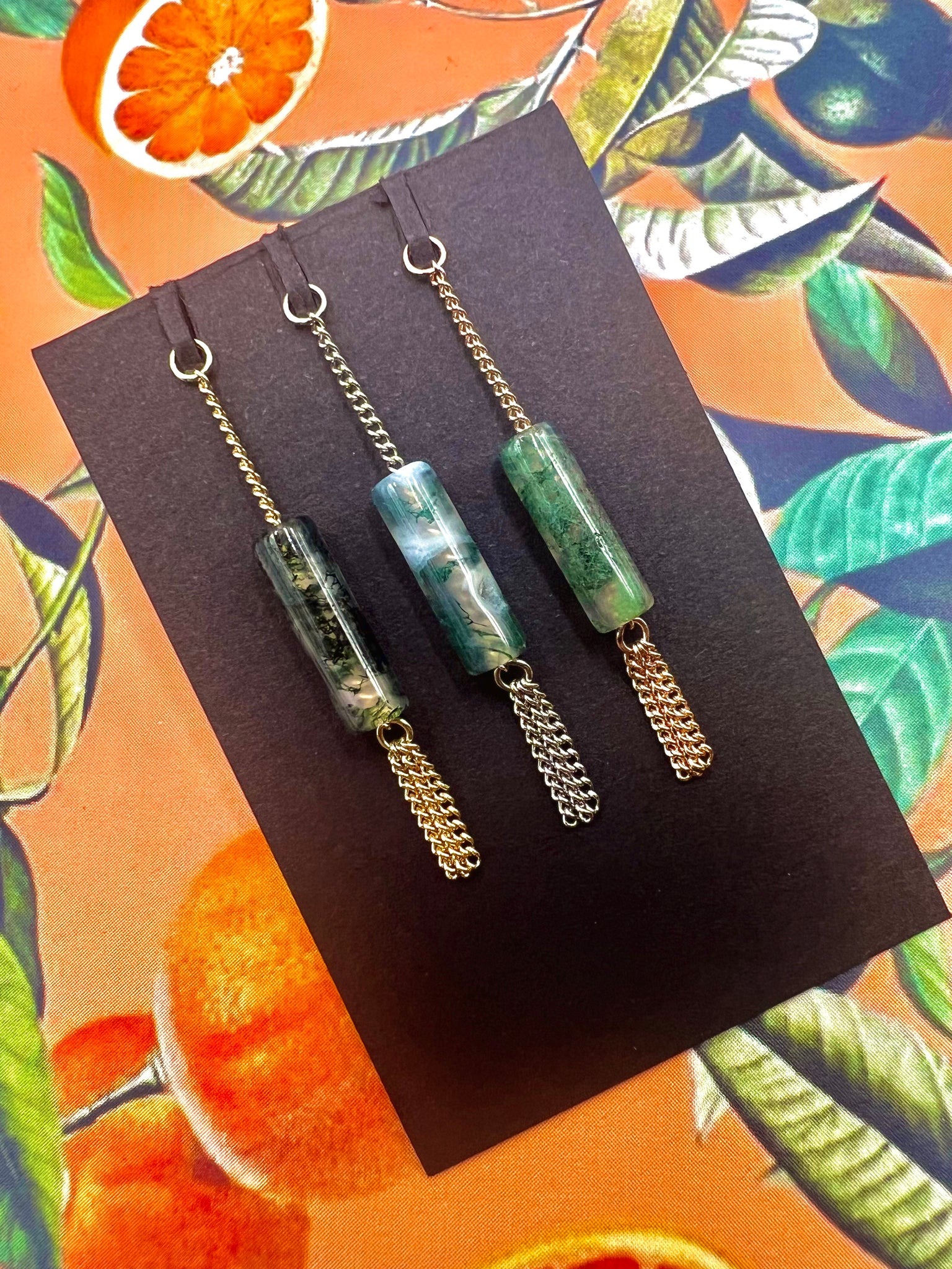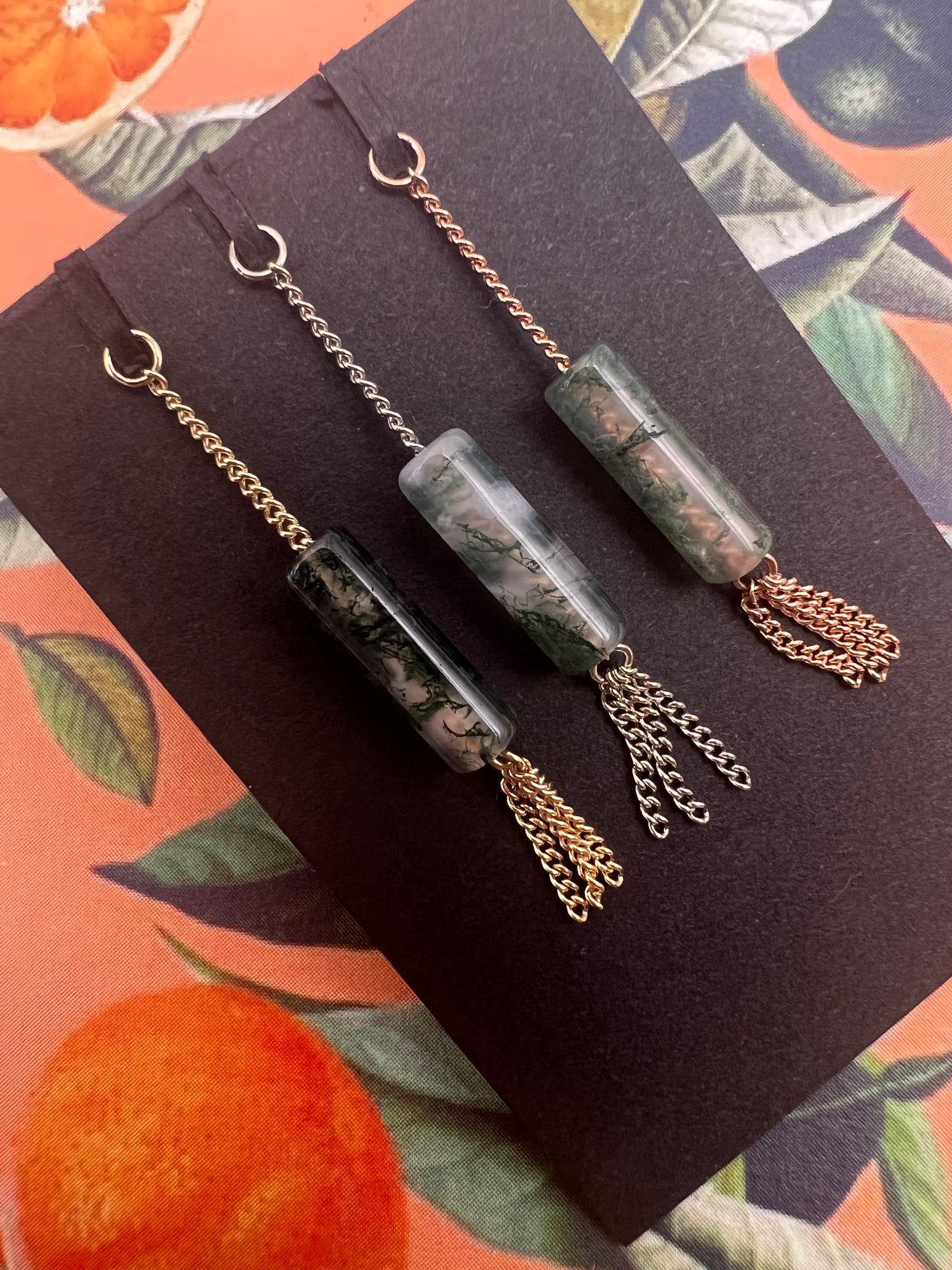 This Charm is a new item we’re introducing into the mix. It all started with some big fuss over these stones that got me looking into them. Well, did I find y’all some DAAAANK Moss Agate. I chose a larger Tube Bead for this project just to see as much of what this stone has to offer. These stones did not disappoint one bit. These are 10x4mm AAA Moss Agate Tube Beads on a 14k 1.2mm Curb Chain that measures in at 40mm in total length.