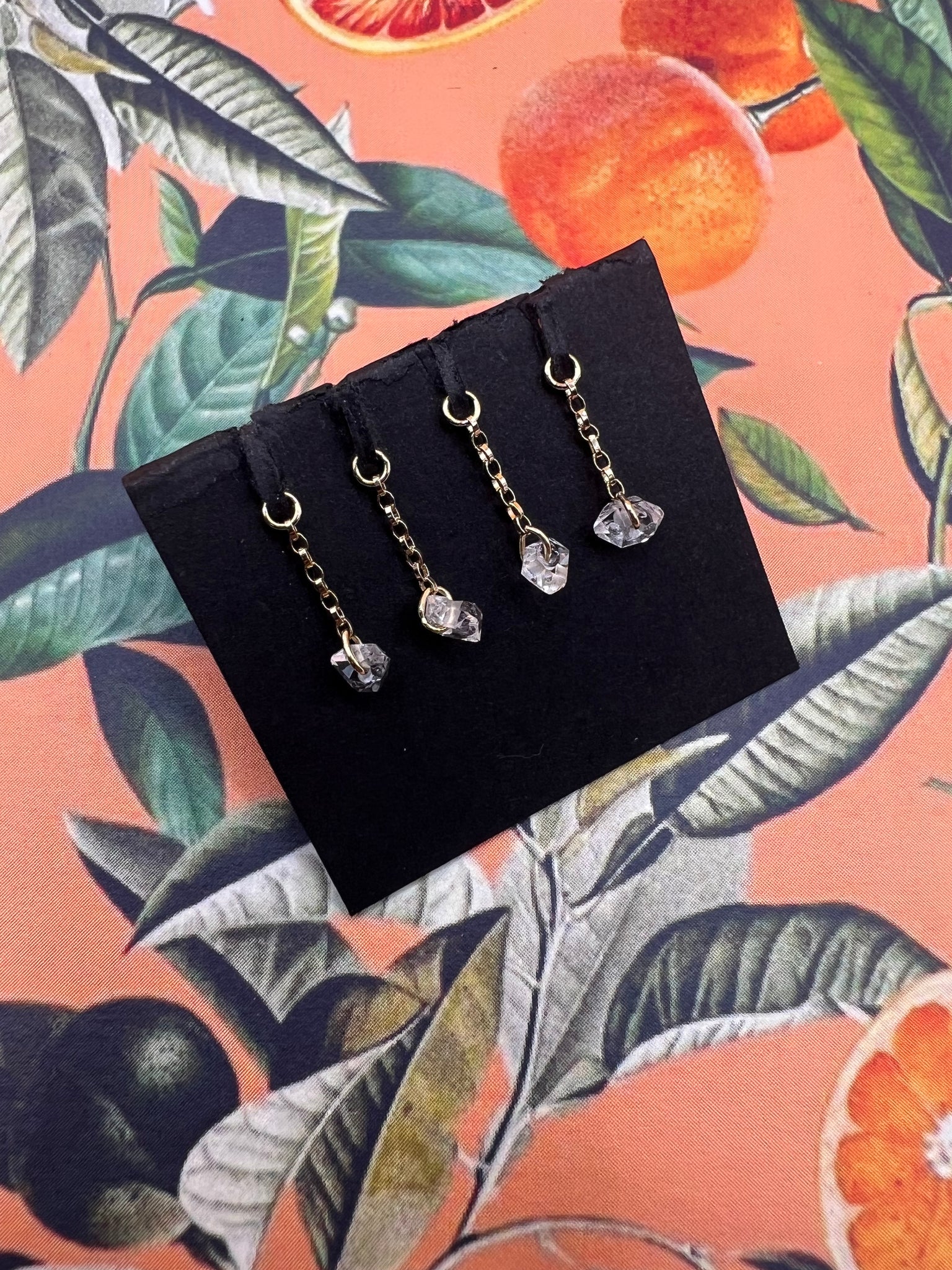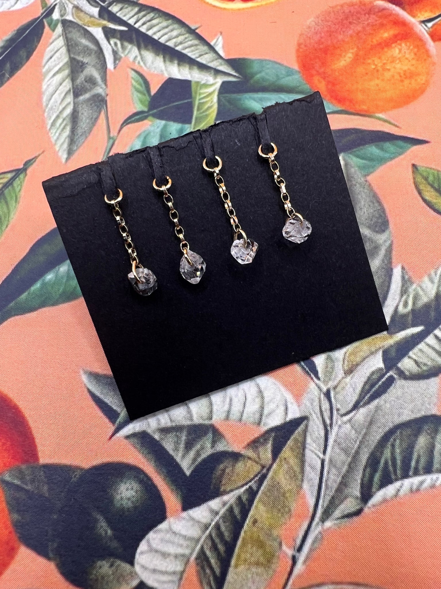These tossers are really perfect for those little set ups that need something new and bold or maybe some delicate chain work but not too much. This is the charm for that. The AAA Genuine Herkimer Diamond Quartz Stone measures at about 4mm on average and is on a 1.5mm Oval Rolo Chain that measures at 8mm not including the jump ring this is on. Everything is Genuine and 14k. Go head toss them on anything!