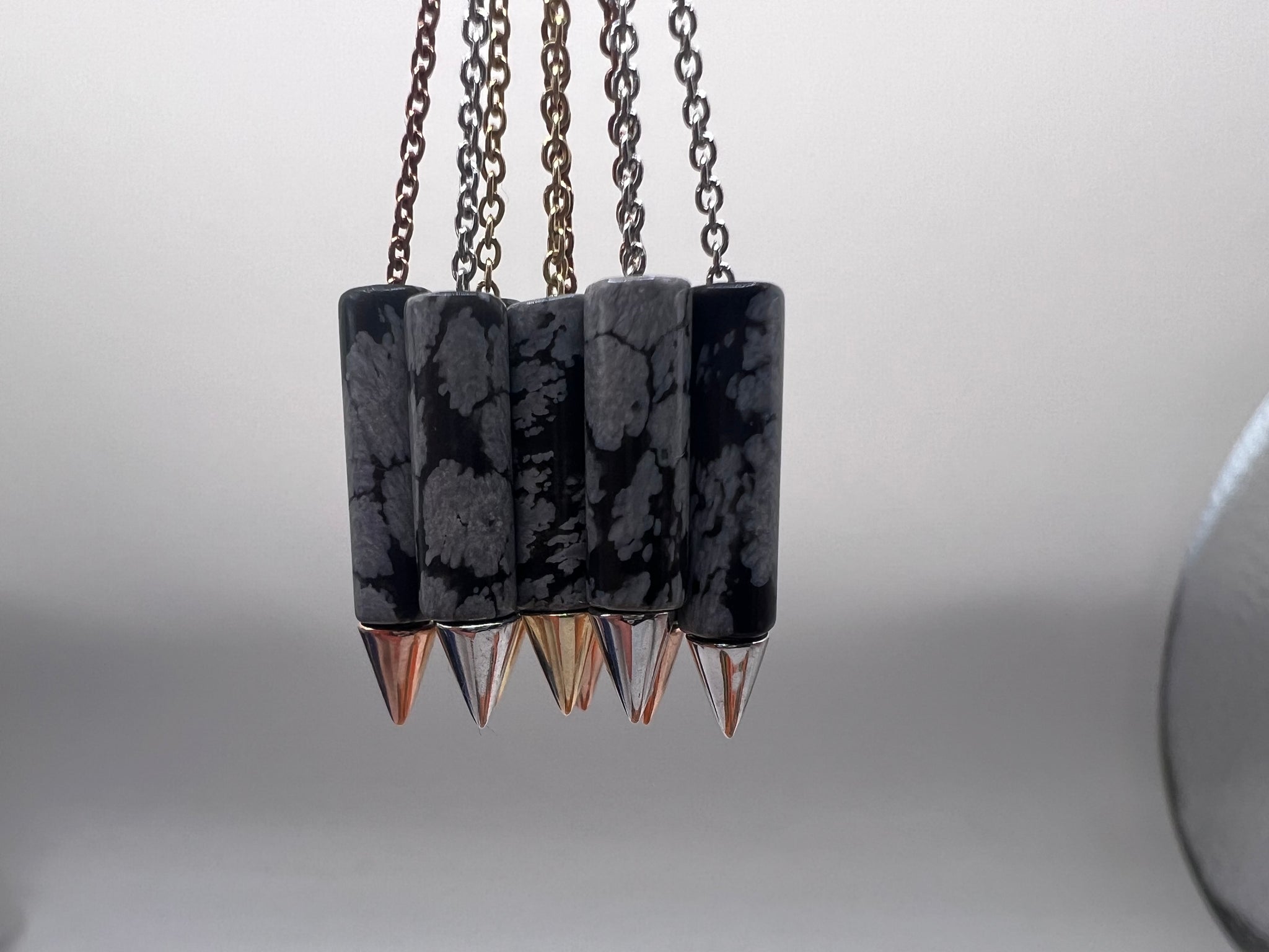 When I made these I had no idea the response we got was coming. These are Genuine Snowflake Obsidian Tube Beads held together by a 1.2mm 14k Cable Chain and 14k Spike. They measure in at 42mm long and are meant to make you stop. These aren’t for the faint of heart. They are light weight and comfortable for that well established hole. Best on a Seam Ring for stability. They are all slightly different obviously in stone but also in the length of the chain based off the size of the bead.